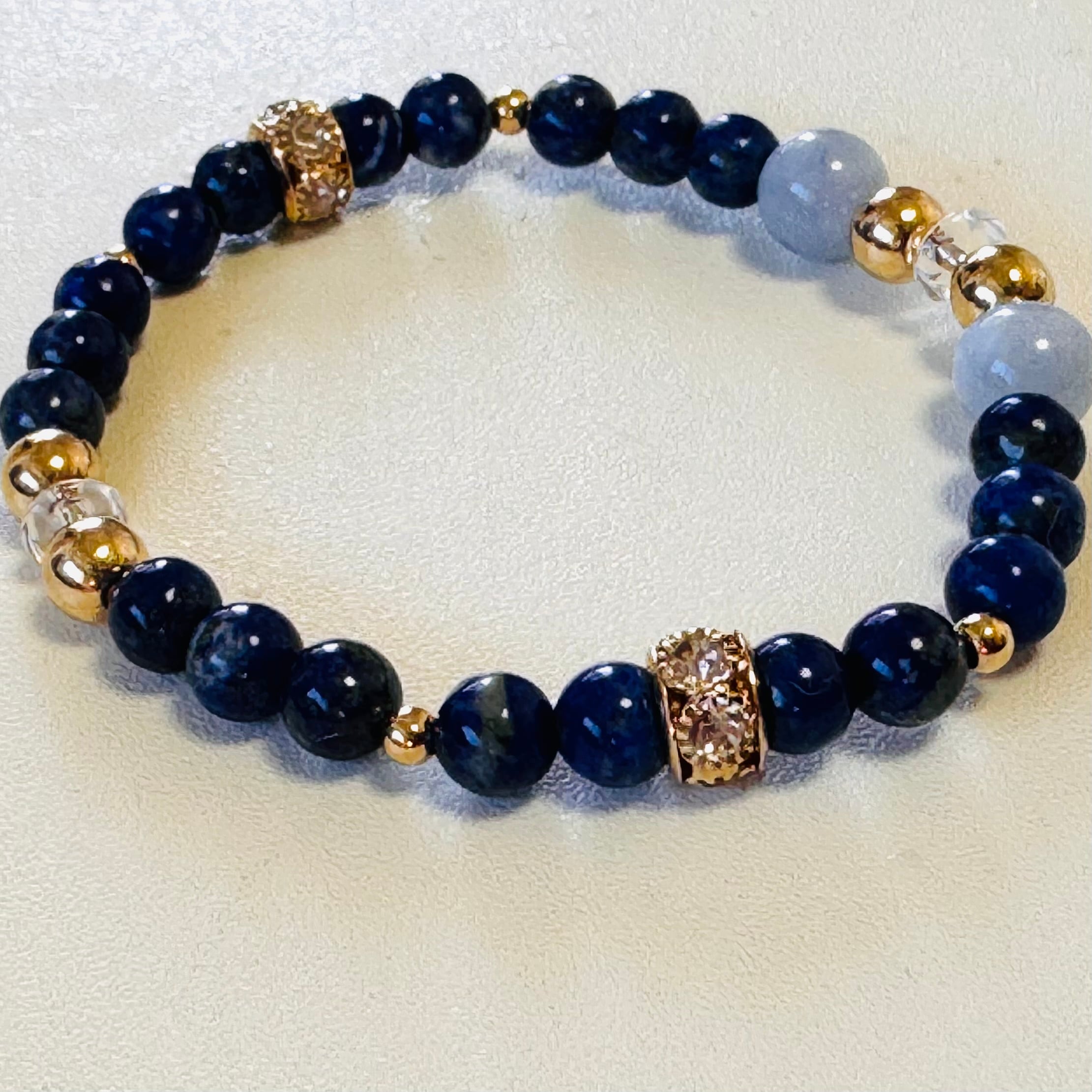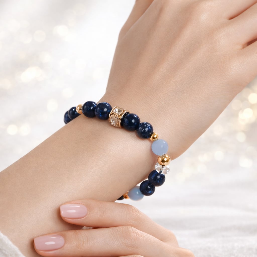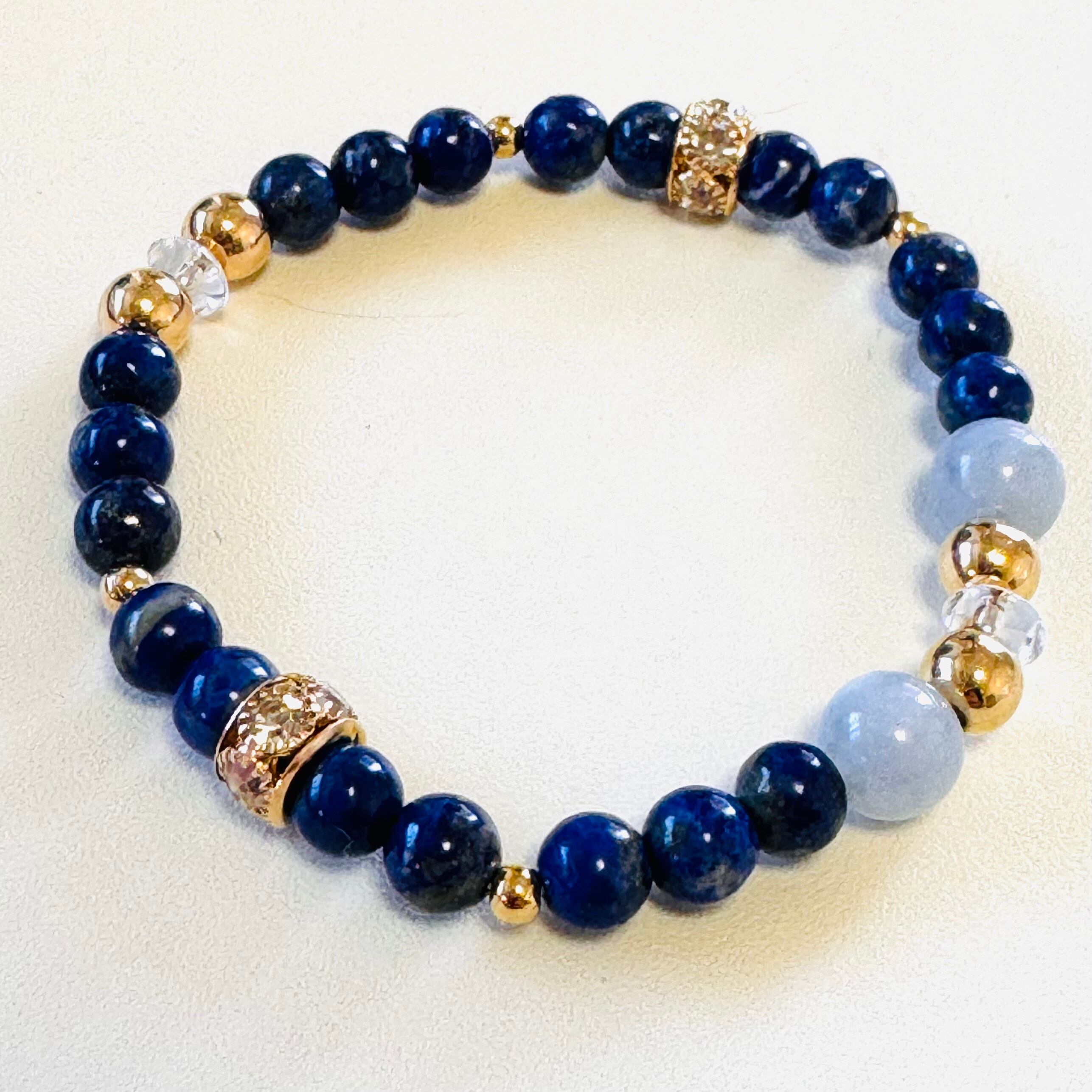 深い青色に白波のような白いカルサイトの模様が施された、幻想的なナチュラルストーンブレスレットです。一つの石から生まれる独特の美しさが特徴で、ラピスラズリ、アクアマリンジェード、水晶がもたらすエネルギーは、心に安らぎを与え、直感を高めるお手伝いをします。特にラピスラズリは、人類最古のパワーストーンの一つとして、持ち主に知恵や真実をもたらす力があるとされています。