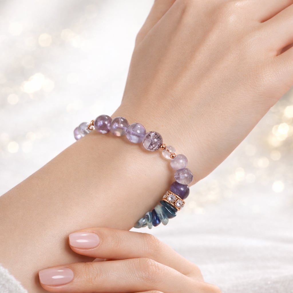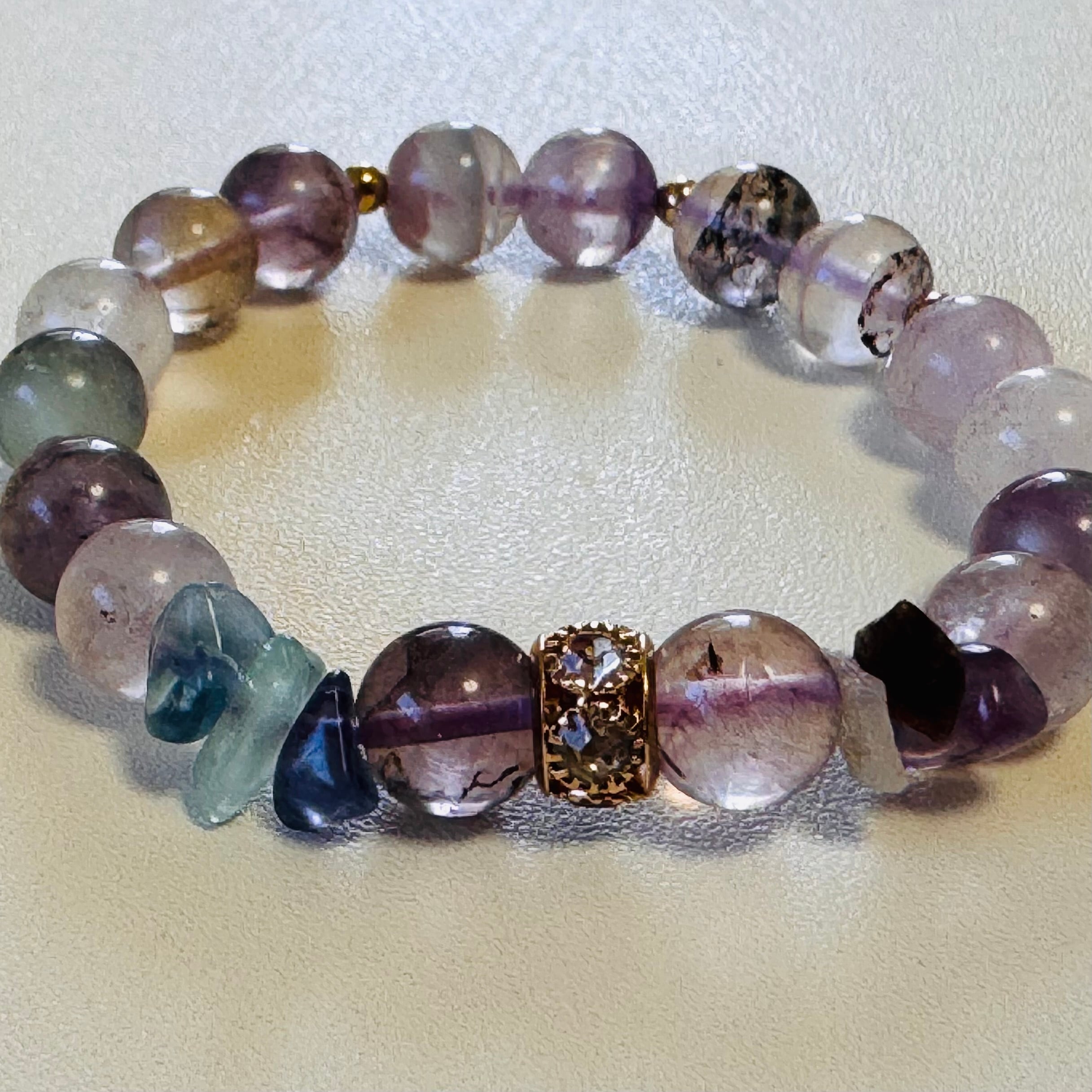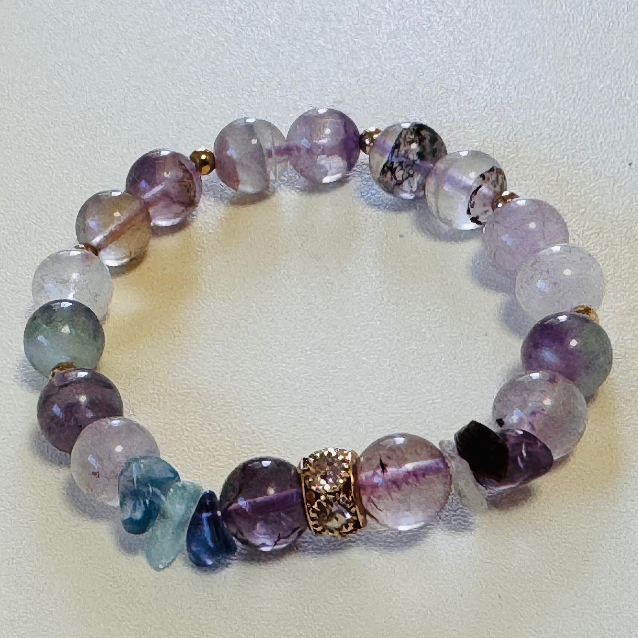 優美なフローライトが魅力のナチュラルストーンブレスレットです。色鮮やかなフローライトは「天才の石」とも称され、思考をクリアにし集中力や判断力を高める力を持っています。ピンクは恋愛運を引き寄せ、グリーンは思考力を高め、ブルーは脳内を活性化する効果が期待できる素敵なブレスレットです。