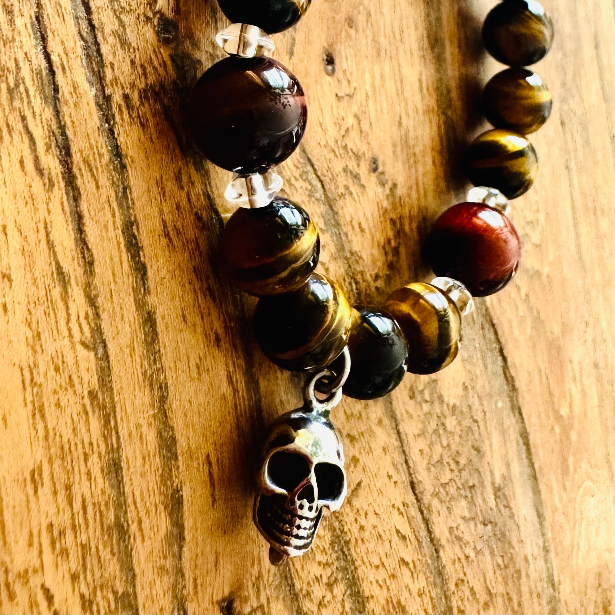 ステンレス製のスカルチャームに、高品質なタイガーアイと水晶を使用した、魅力的な組み合わせ