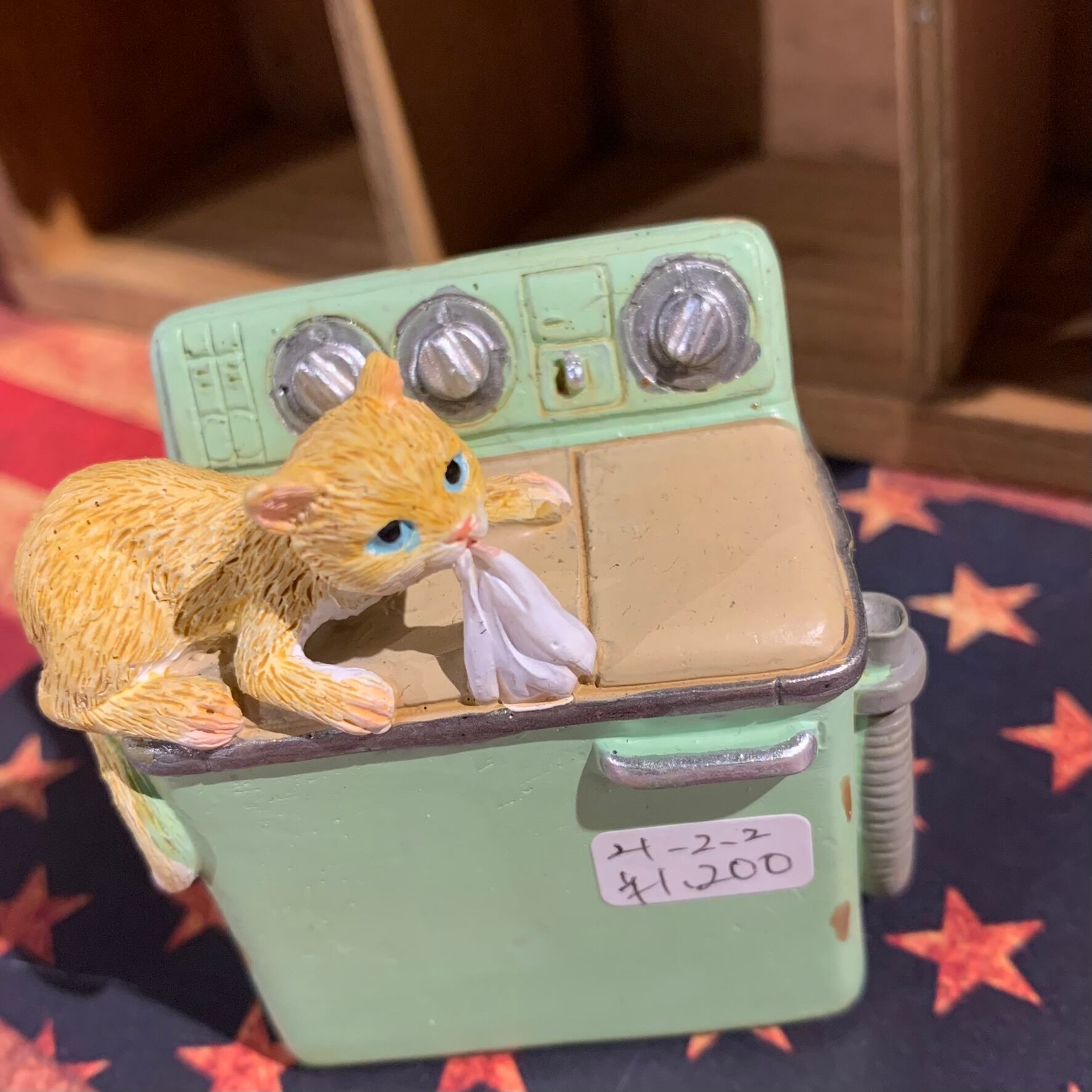 レトロ家電に悪戯猫ちゃんたちがかわいい置物です。集めて昭和な世界観出しても楽しいし、単品でも存在感あります。