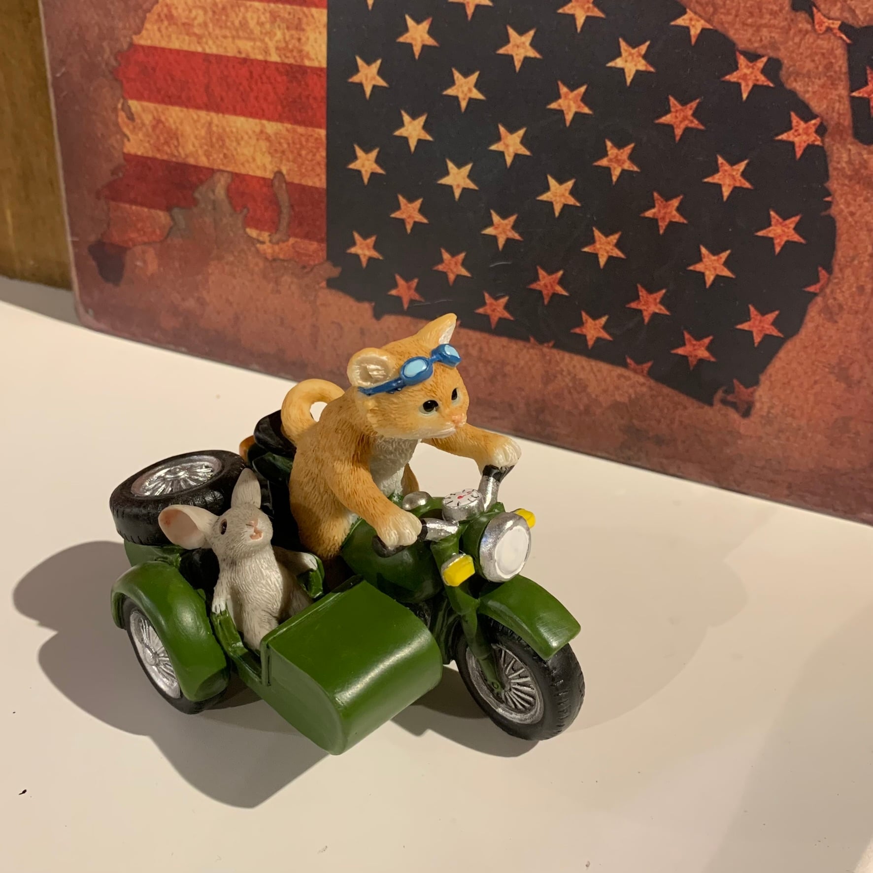ゴーグルしてバイクにまたがる猫ちゃんとサイドカーにドンと座ったネズミのコンビ